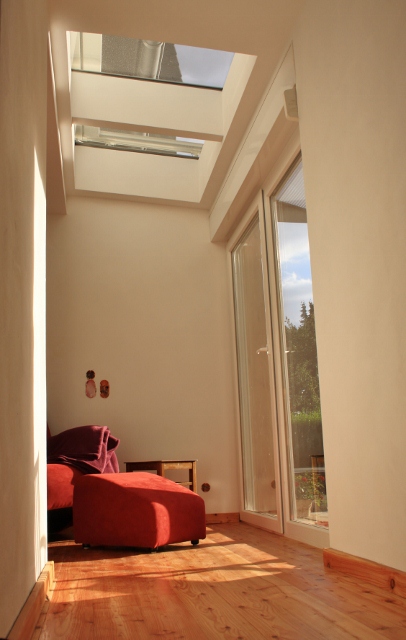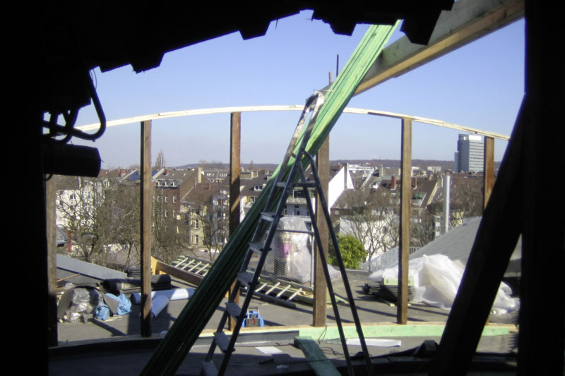 In einem Düsseldorfer Büroturm versteckt sich hinter dem kruden Bretterwerk eine Siebdruckwerkstatt. Die Atmosphäre im diesem Großraumbüro wurde durch den starken Kontrast von Farbe, Form und Material deutlich aufgelockert.