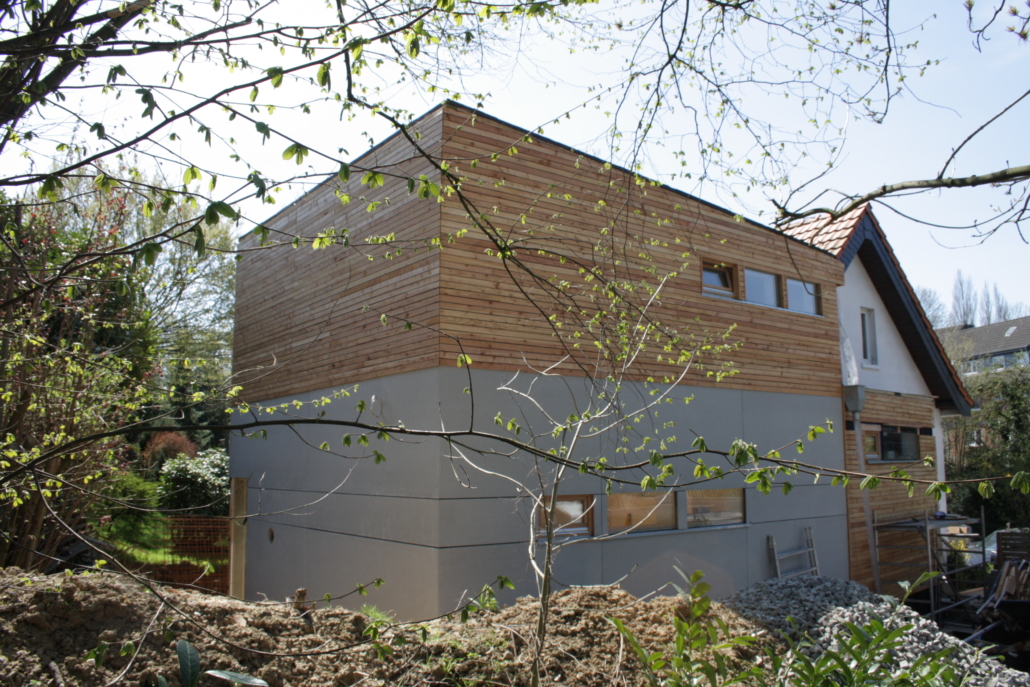 Nach Familienzuwachs wuchs auch der Bedarf an Wohnfläche in einem Einfamilienhaus in Düsseldorf-Erkrath. Dafür wurde im Garten ein 80 Quadratmeter großer Anbau aus Holzständerwerk mit Zellulosedämmung erstellt. Für ein organisches und modernes Aussehen sorgt eine Fassade aus Lärchenrombusschalung in Kombination mit Faserzementplatten.