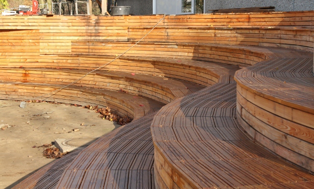 Unterkonstruktion und (Front-)Bekleidung wurden in Lärche ausgeführt, als Deckbelag (Dauerholz) wachsgetränkte Kiefer verbaut. Als technische Herausforderung bei der Biegung der Lärchenverkleidung in der Wellenform der Konstruktion waren die Eigenschaften dieser Holzart in puncto maximale Biegung, Rissbildung und Abknicken zu berechnen.